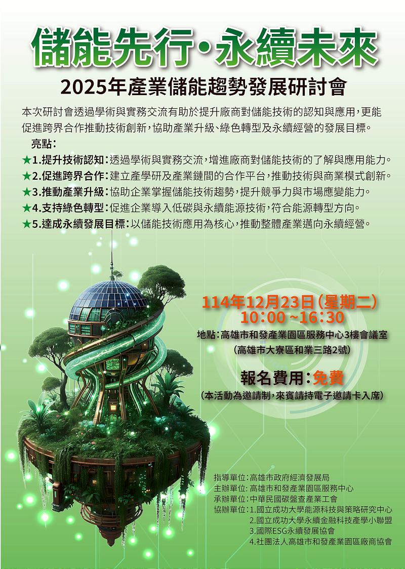在能源轉型與淨零排放已成為產業發展關鍵議題之際,「2025年產業儲能趨勢發展研討會」,12月23日於高雄市和發產業園區服務中心圓滿落幕。本次研討會以「儲能先行・永續未來」為主軸,聚焦企業在實務層面最迫切關心的能源應用、儲能技術與整合解決策略,整體規劃清楚、執行順暢,成功促成高品質的產業交流。